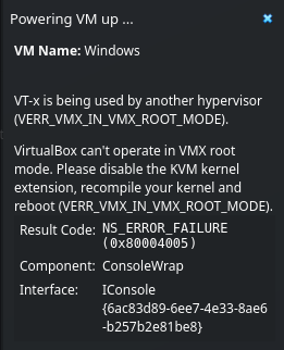 Depuis que j’ai installé Debian 13 sur mon poste de travail, j’ai rencontré des problèmes avec VirtualBox. Au lancement de n’importe quelle machine virtuelle, j’ai l’erreur VERR_VMX_IN_VMX_ROOT_MODE qui s’affiche au lancement de ma VM, et VirtualBox refuse de la lancer.